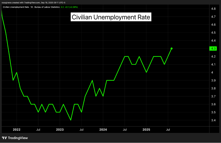 Right now, GDP is growing at a 3% clip. This is interesting given the weakening jobs numbers. As you can see below, the unemployment rate has been trending upward for the last 12 months.