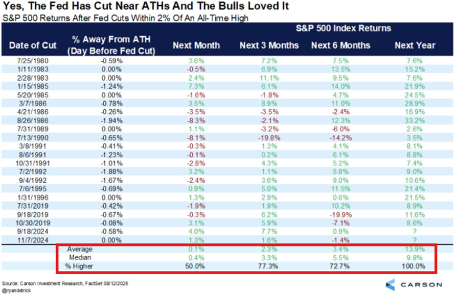 Only 20 times in history has the Fed cut rates with the S&P 500 at all-time highs. And in each of those occurrences, the market was higher 12 months later by an average of 13.9%