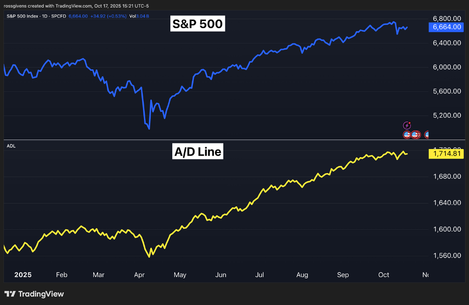 The advance/decline line, which keeps a running tally of how many stocks went up or down each day, is holding near its highs.