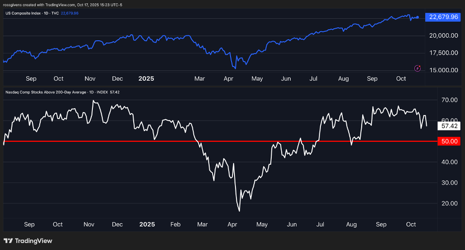 The percentage of Nasdaq stocks above their 50-day moving averages currently sits at 57.4%.