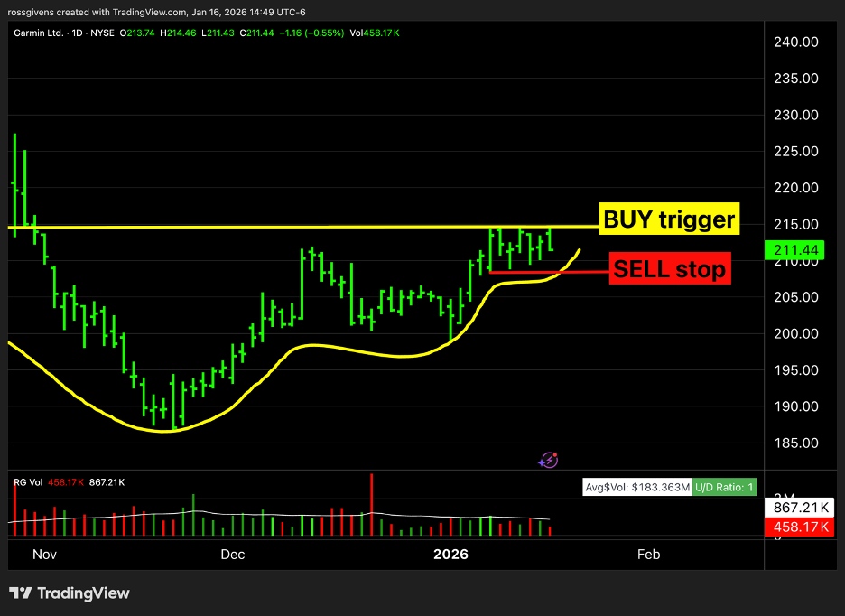 And while Garmin is unlikely to surge +100% in two months like some of the others, the risk here is minimal. Thanks to tight price action over the last two weeks, one only needs to risk 3% on the trade.