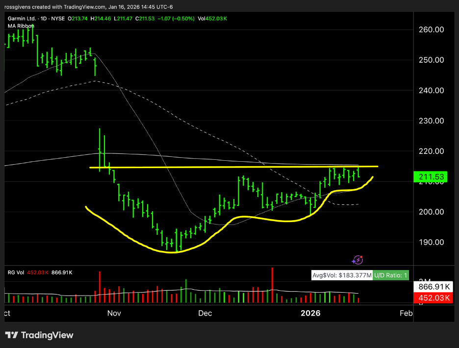 GRMN formed a similar pattern last year before surging 25% higher. With the tailwind of buying in space stocks, we could easily see that replicated here.