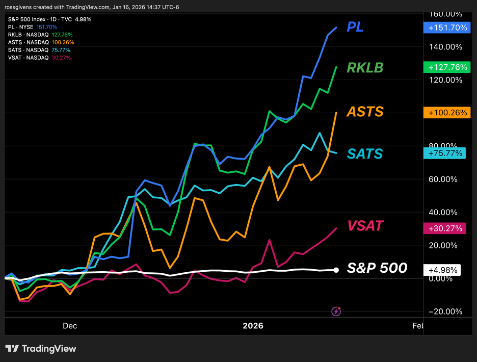 A lot of the stocks in this group are extended. Planet Labs (PL) is up 152% in the last 60 days. Rocket Lab (RKLB) and AST SpaceMobile (ASTS) have more than doubled.