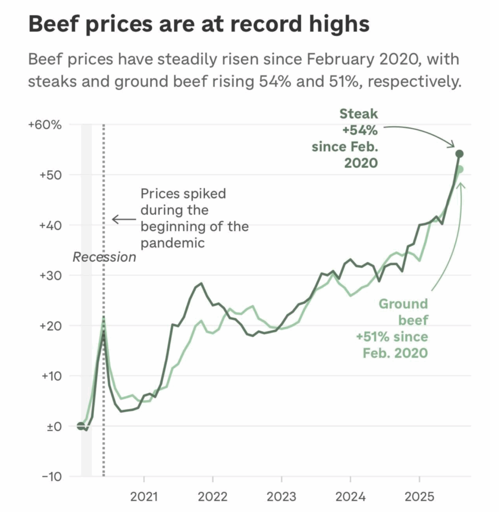 Beef and steak prices, which are a staple in my house, are up more than 50%.