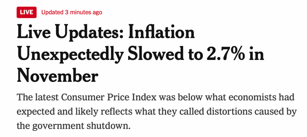 And shockingly, inflation came down in November. Prices were higher, but not by as much as they had been in previous months.